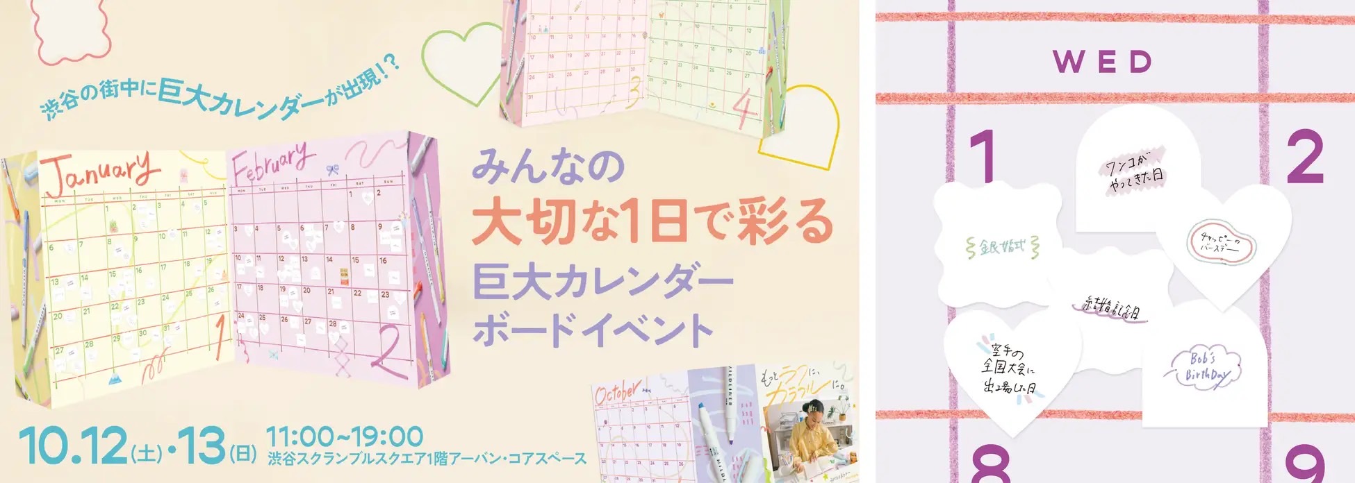 本グローバルSNSキャンペーンでは、SNSを主軸として、気軽に表現と創作を楽しめるアイデアを広げていきます。デジタルのコンテンツが主流となっている現代において、『書くこと』をもっとラフに楽しんでもらえるよう、多くの方に『マイルドライナー』がある生活の魅力を届けるため、公式アカウントでは簡単に楽しめる線やモチーフのアイデアを発信したり、また、2024年10月12日(土)・13日(日)渋谷スクランブルスクエア1階 アーバン・コア スペースにて、自分にとっての『大切な1日』で巨大カレンダーを彩る参加型イベントを実施します。