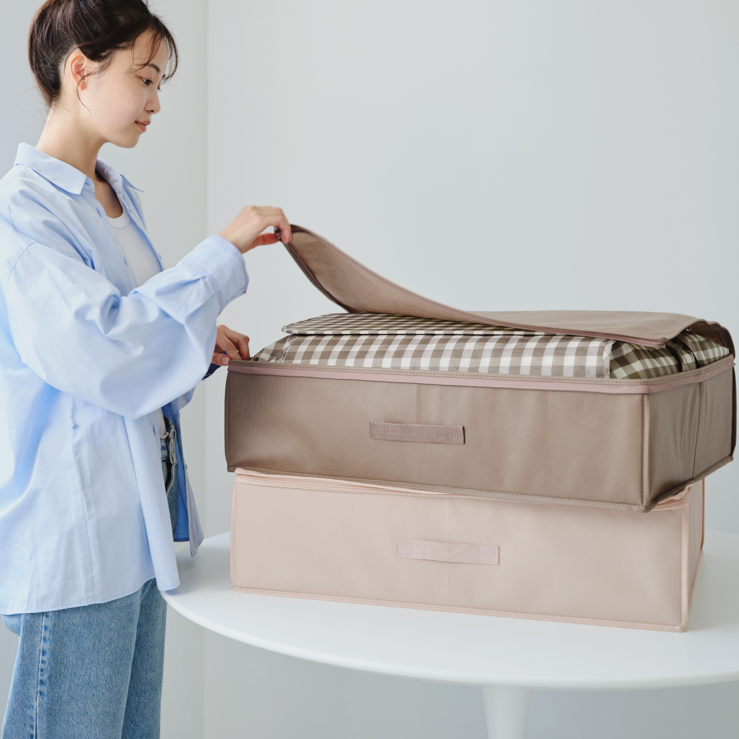 布団のプロがつくった、お部屋のインテリアに馴染む収納袋。お部屋やクローゼットの雰囲気や印象に溶け込みながら、オールシーズン使える収納袋です。すっきりとしたデザインと、インテリアになじむやさしい色合いで、クローゼットの中で重ねても、お部屋にあえて出しっぱなしでも使いやすいデザインと機能性をかなえました。