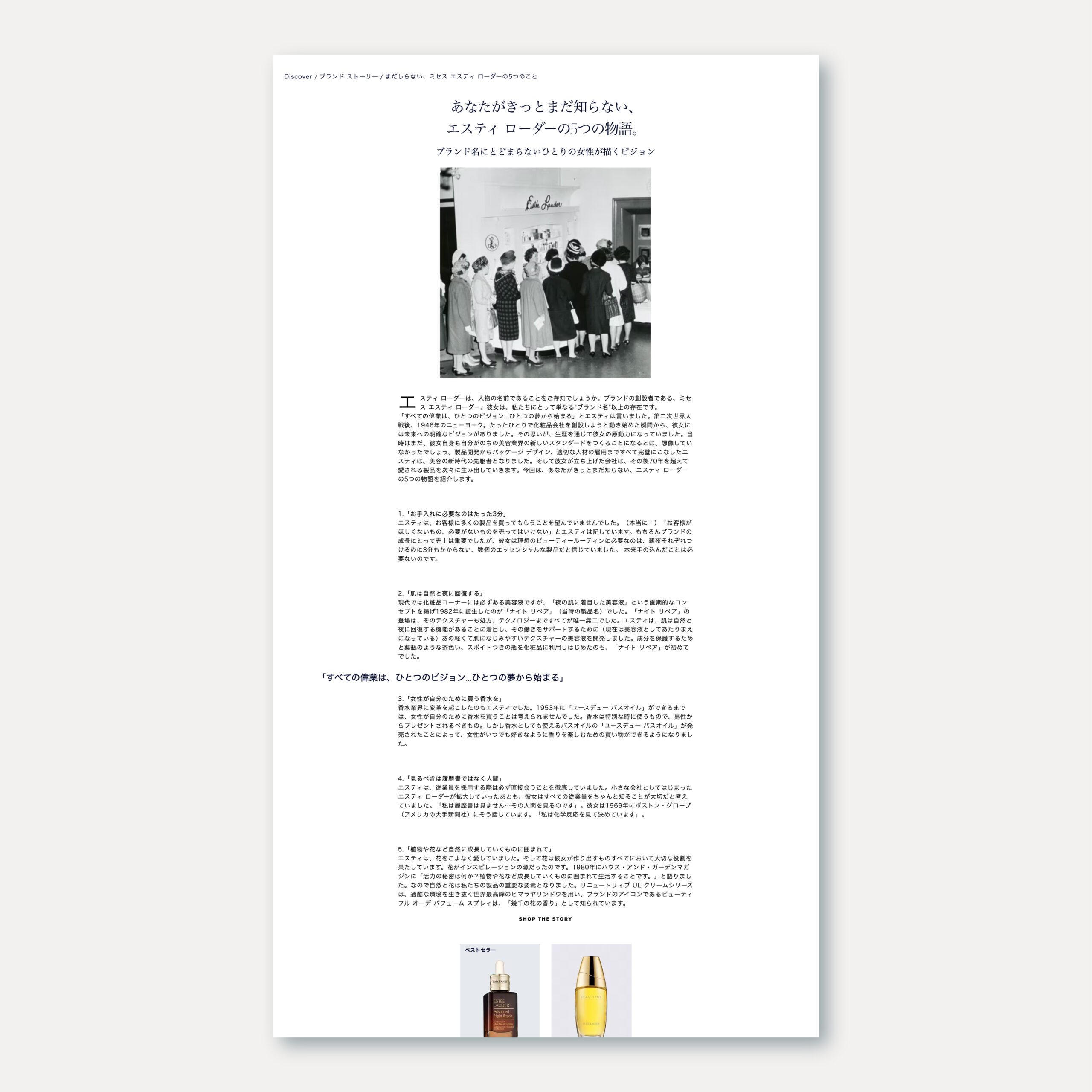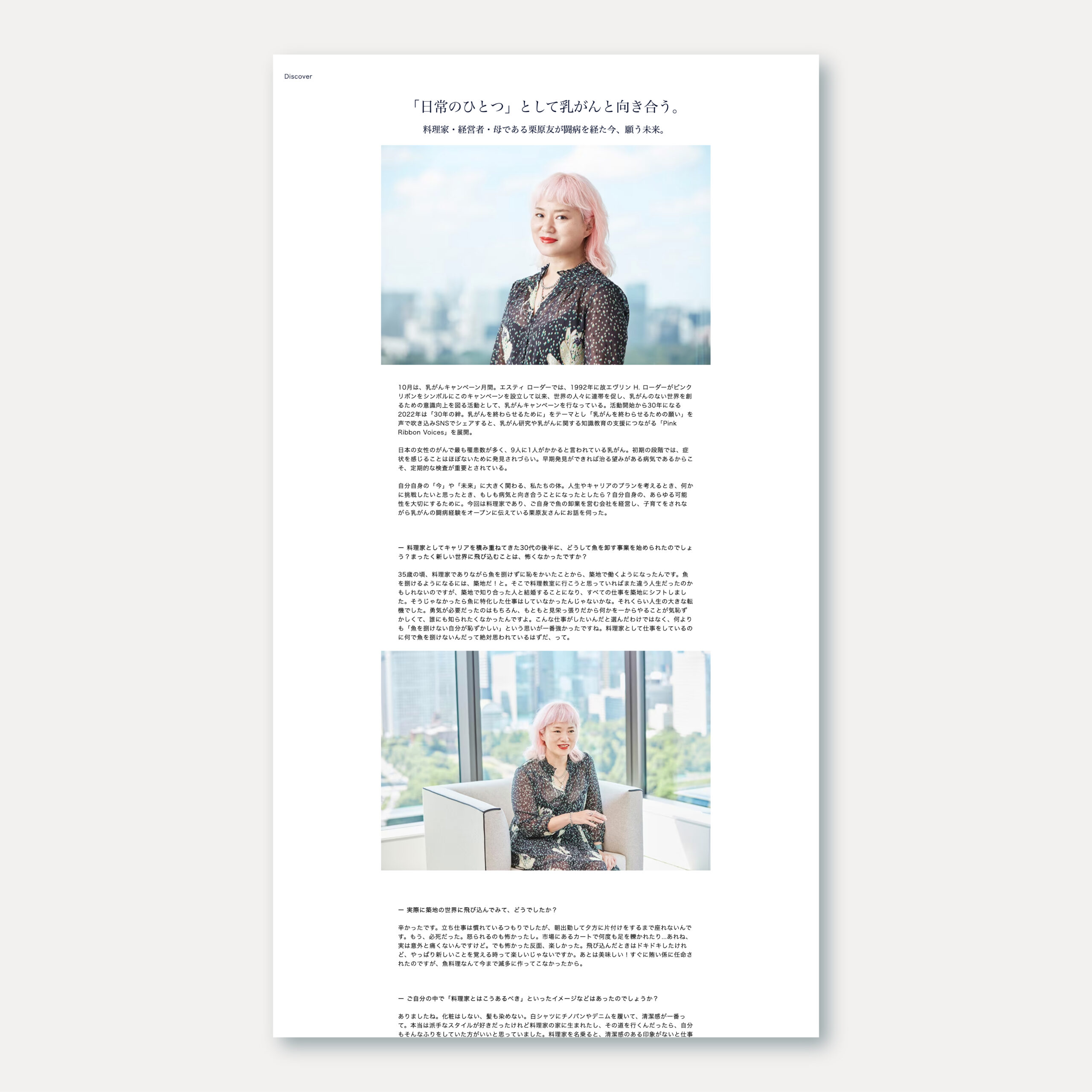 エスティ ローダーが掲げるフィロソフィーである「Be aware of your infinite possibilities.」を軸に、日本のマーケットに合わせた文脈でコンセプトを設計し、オリジナルコンテンツを展開・発信をするためのプラットフォームとしてWEB Magazine「Discover」を企画・制作し、立ち上げをプロデュース。Discoverでは、新しい未来を切り拓いていく人々と、これからの時代の多様な美しさや個々人のあり方、持続可能な社会のあり方について共に考えるコンテンツを発信している。