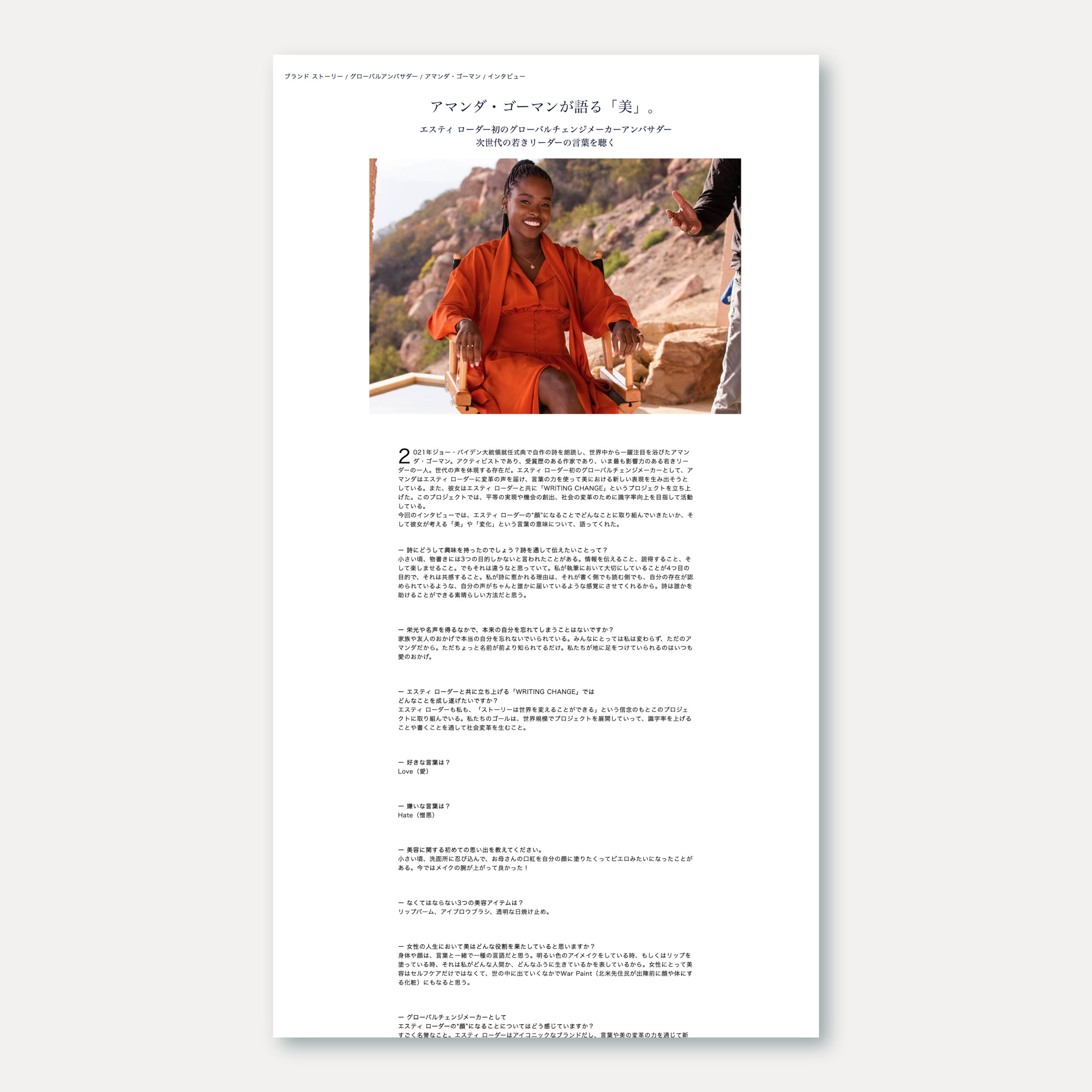 などを記事や動画を通じて発信。企画から制作までを一貫して担当。ブランドの価値観を体現している人のキャスティング、NY本社チームが展開するコンテンツの翻訳、グローバルで展開するアクションに紐づく日本版のインタビュー記事・映像制作を含め、日本とNYの取り組みの架け橋となるような設計を行う。